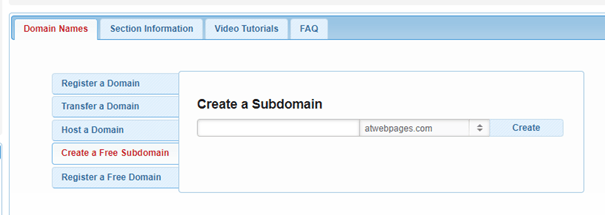 Go to Hosting Tools > Domain Manager. Select “Create a free subdomain”, fill in the subdomain’s name, and click Create:
