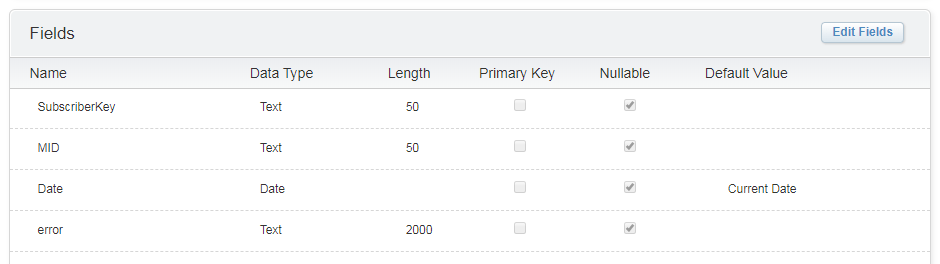 Here is an example of a Shared Data Extension created for error logging. It holds information about the Subscriber, MID, date of the event and the error message itself: